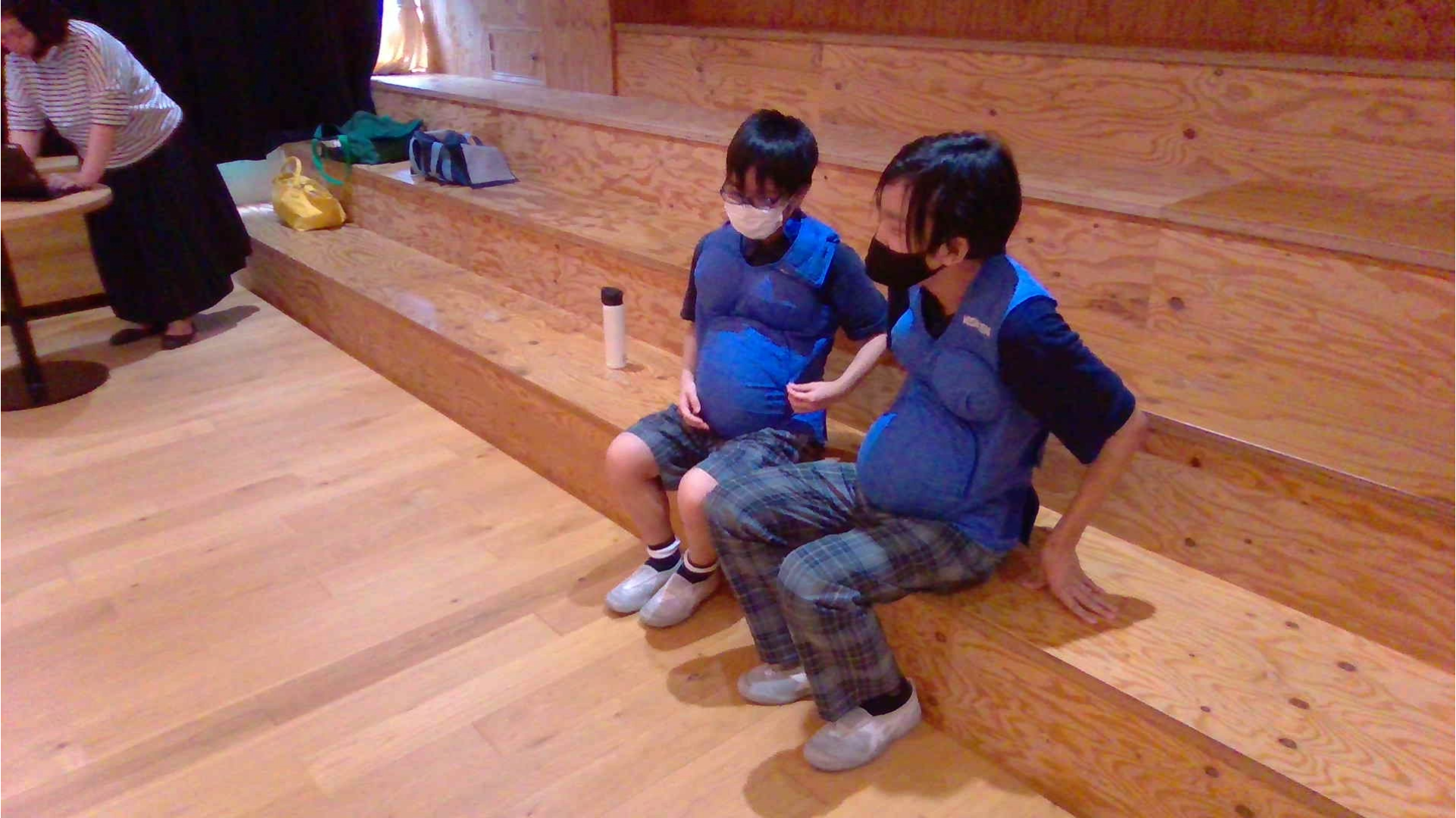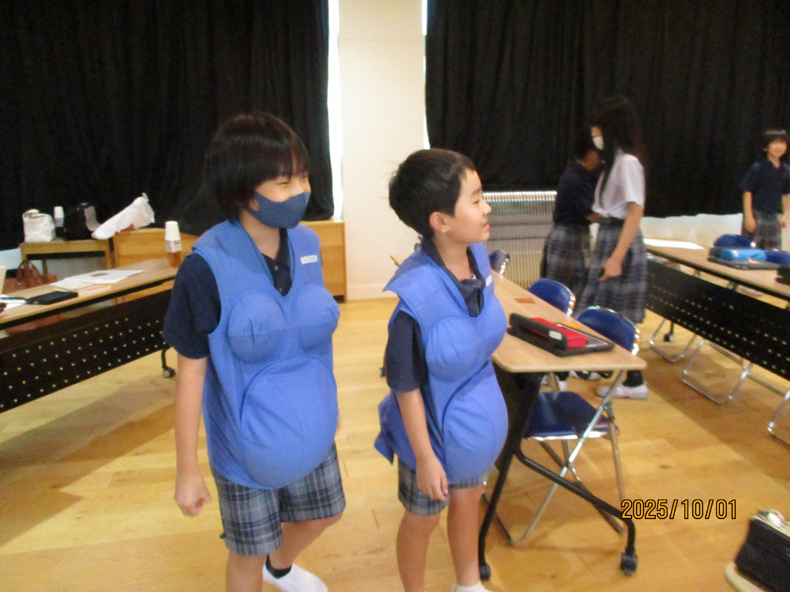 まず、実際に赤ちゃんの心拍音や産声を聞きながら、「性」や「思春期・二次性徴」、「生命の誕生の仕組み」、「こころの成長」について、講義をしていただき、そのあとは受精卵から生まれるまでの人形を見て触ったり、7kgほどのおもりがついた妊婦ジャケットを着用し、妊婦体験をしました。