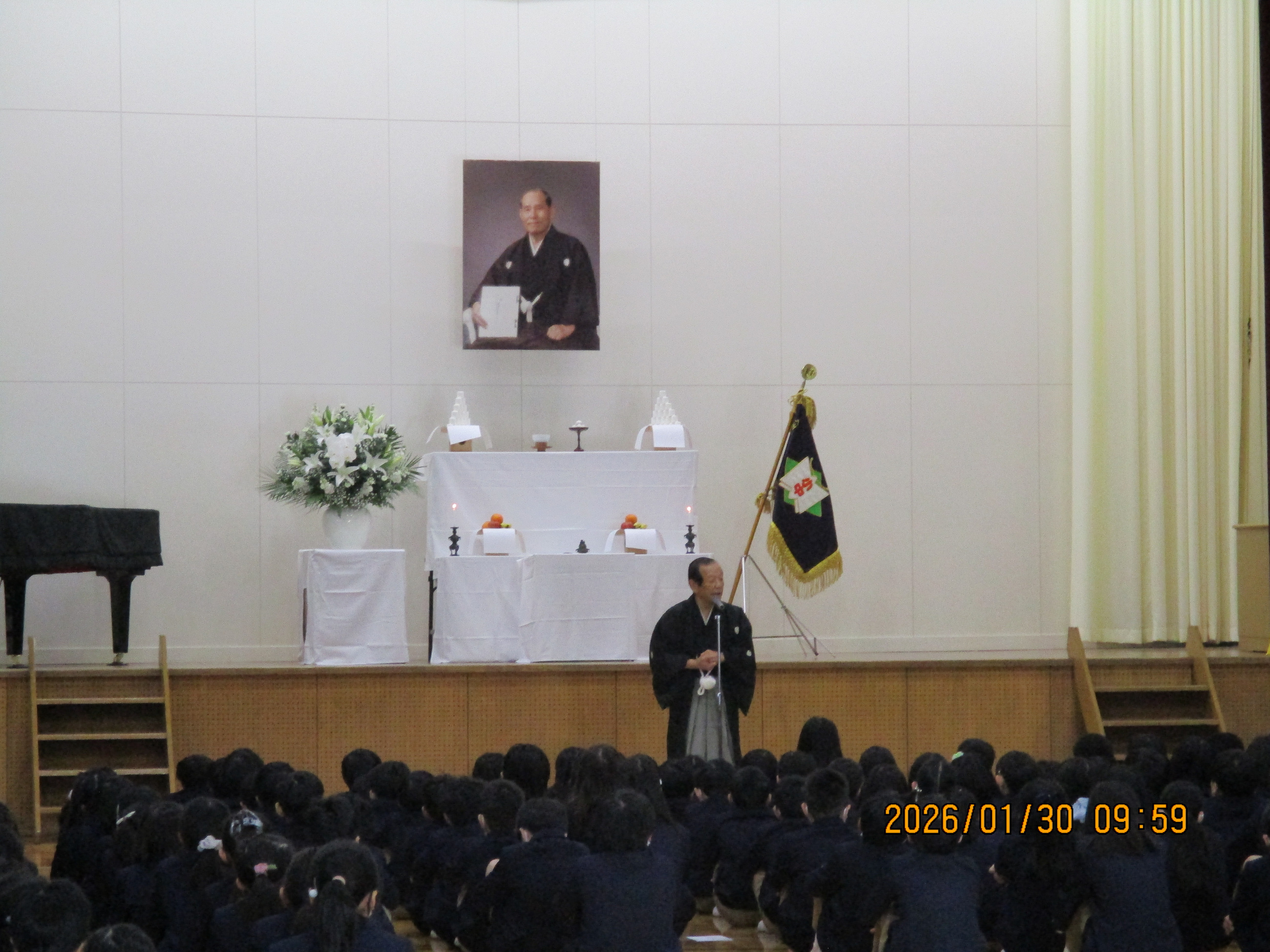 January 30, 2026 1月 学祖追悼式 学祖追悼式 本日、本学園を創設してくださった安部芳雄先生を偲ぶ学祖追悼式を執り行いました。 校長先生からは、この学校での出会いに感謝することや、本校で学ぶことの意味についてお話がありました。理事長からは、本学園の歩みや芳雄先生の想いについてお話をいただきました。 最後は、代表児童生徒が、夢をもって志のために学び、明日へ飛躍することを誓い、心を込めて学園賛歌と校歌を歌いました。 フォトギャラリー