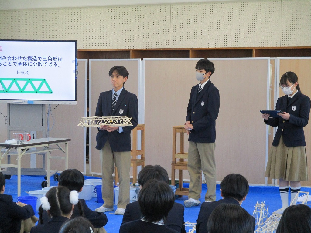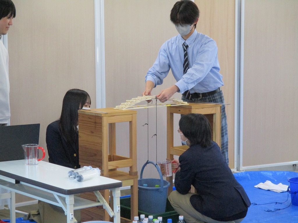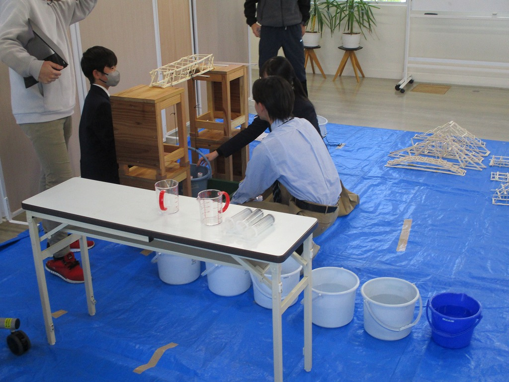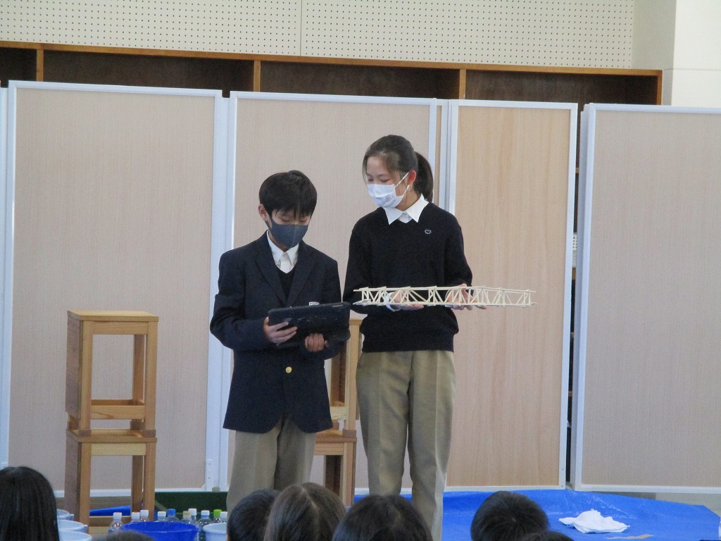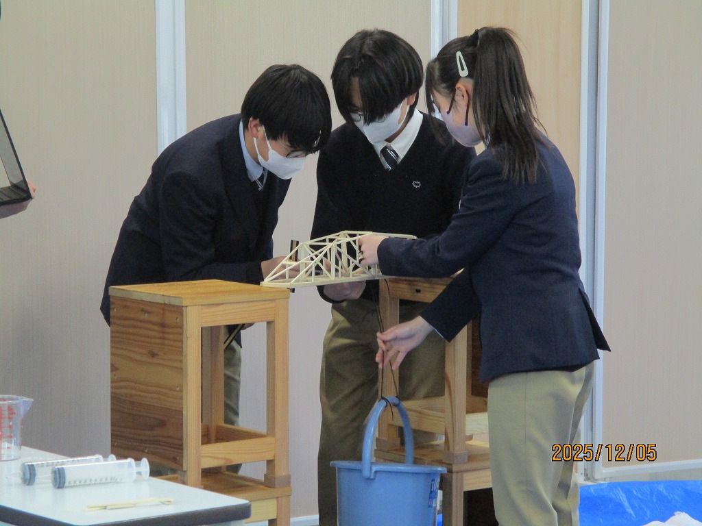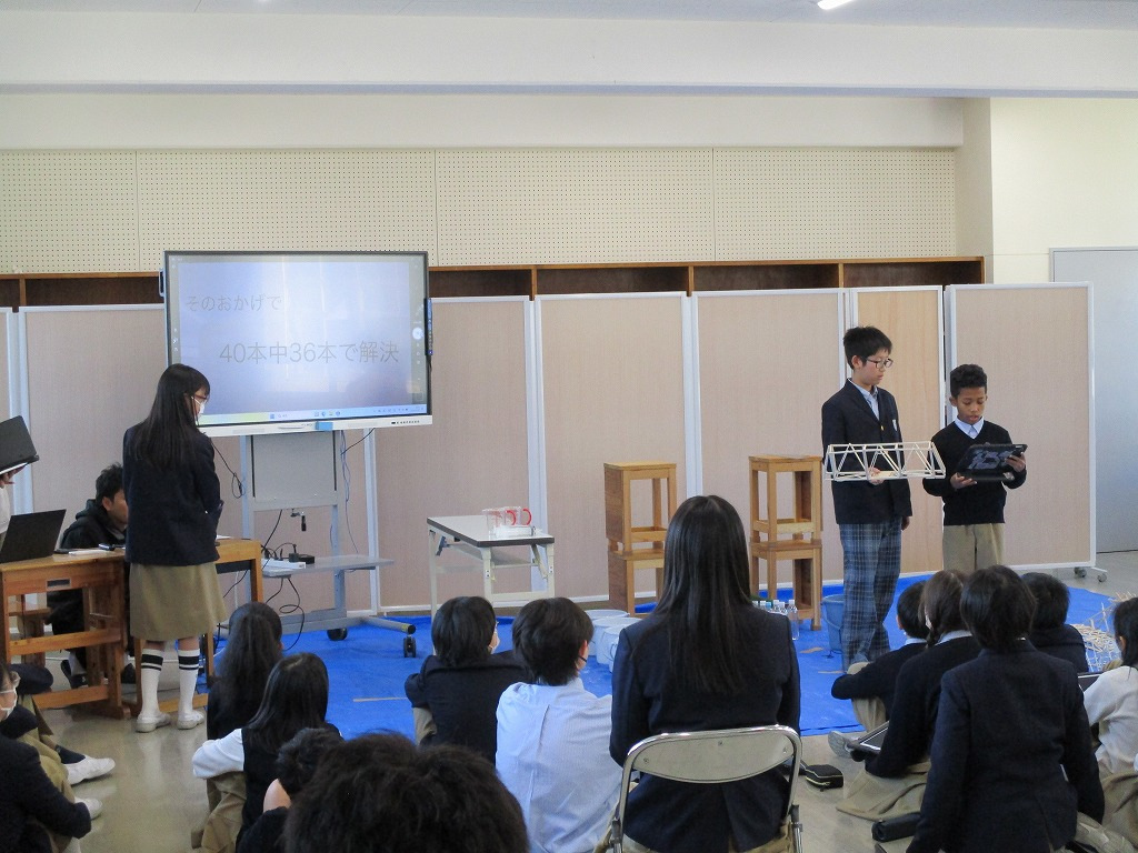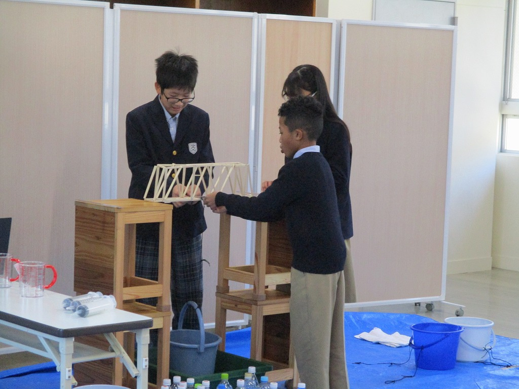 校内の大会に向け、各チーム、橋の構造を計算しながら探究的な学びを進め、本番当日を迎えました。大会では、各チームが制作した橋にバケツをぶら下げ、そのバケツに水を入れていきました。橋が折れないギリギリまでバケツに水を入れ、何キロの水に耐えるのかを競いました。水の量が増えたり、橋がきしむたびに歓声が上がっていました。総合得点では各班のプレゼンテ一ションや橋の美しさの芸術点も含まれました。優勝チームはなんと9㎏120gの重さまで耐えることができました。
