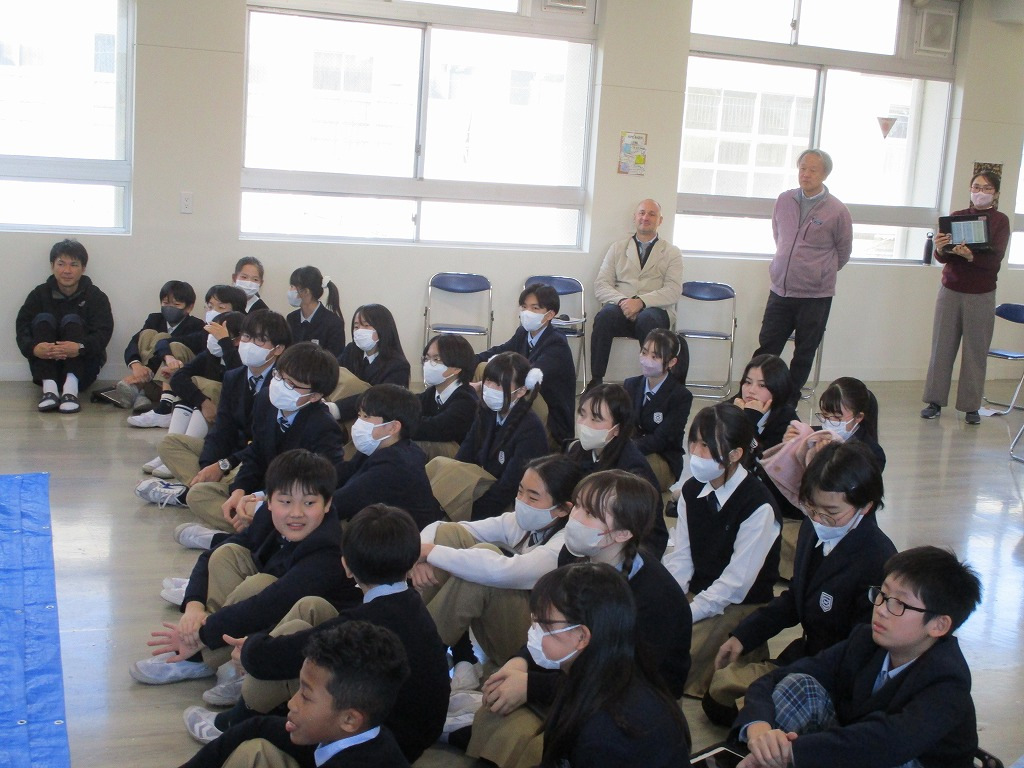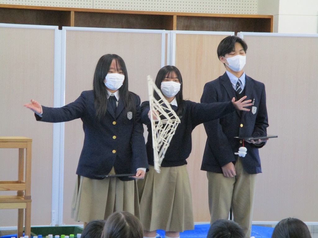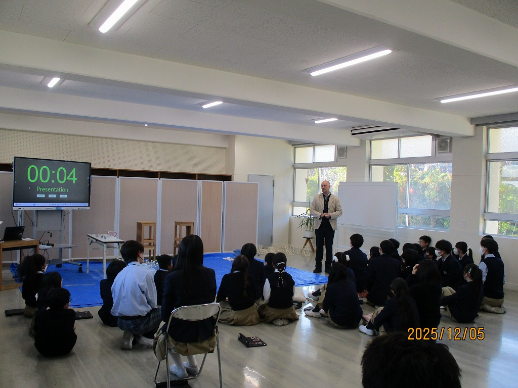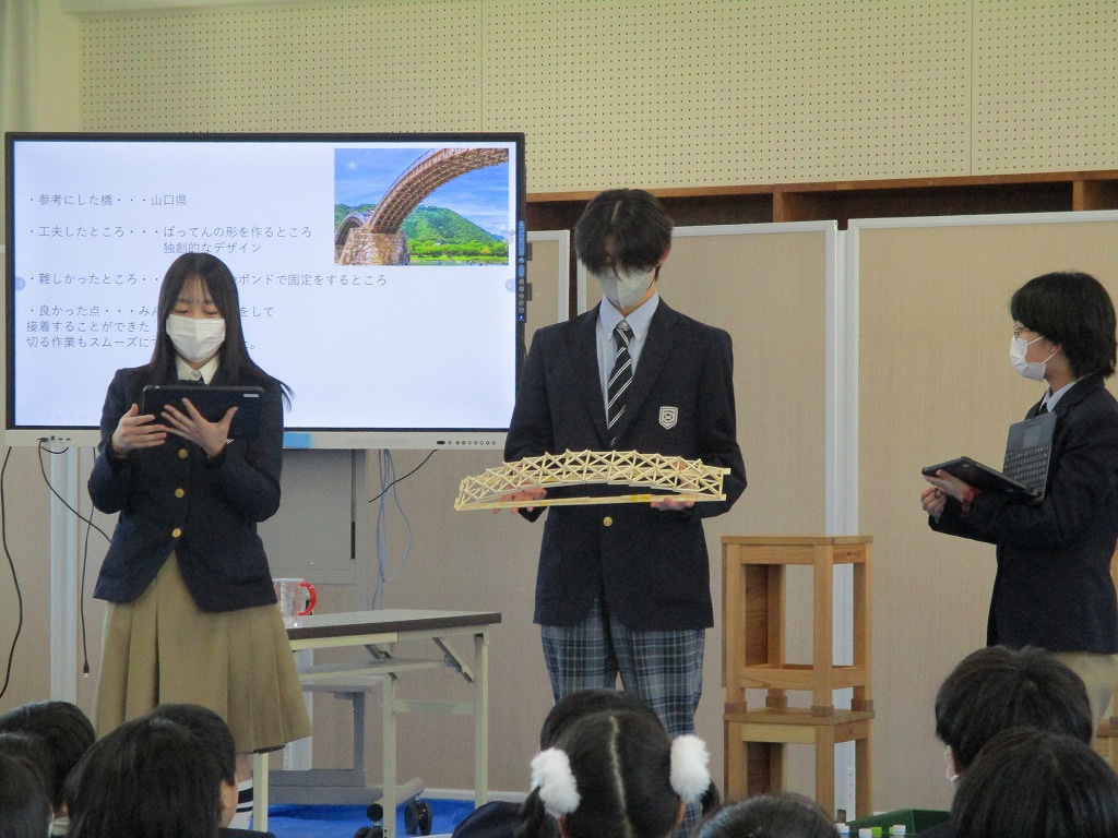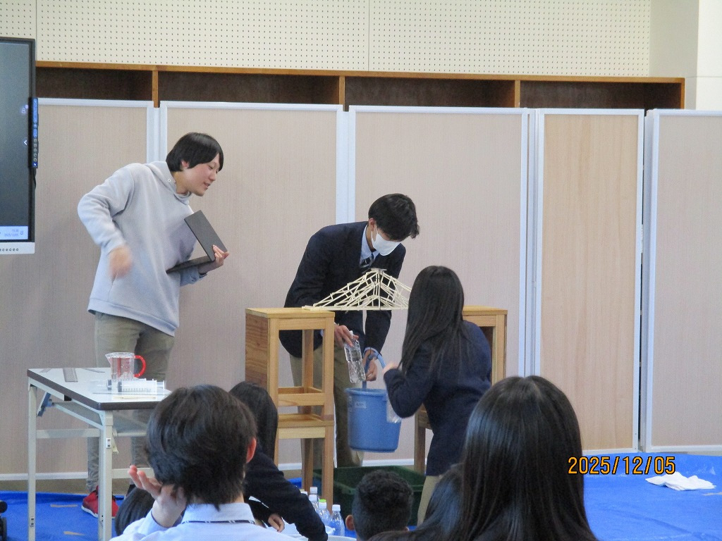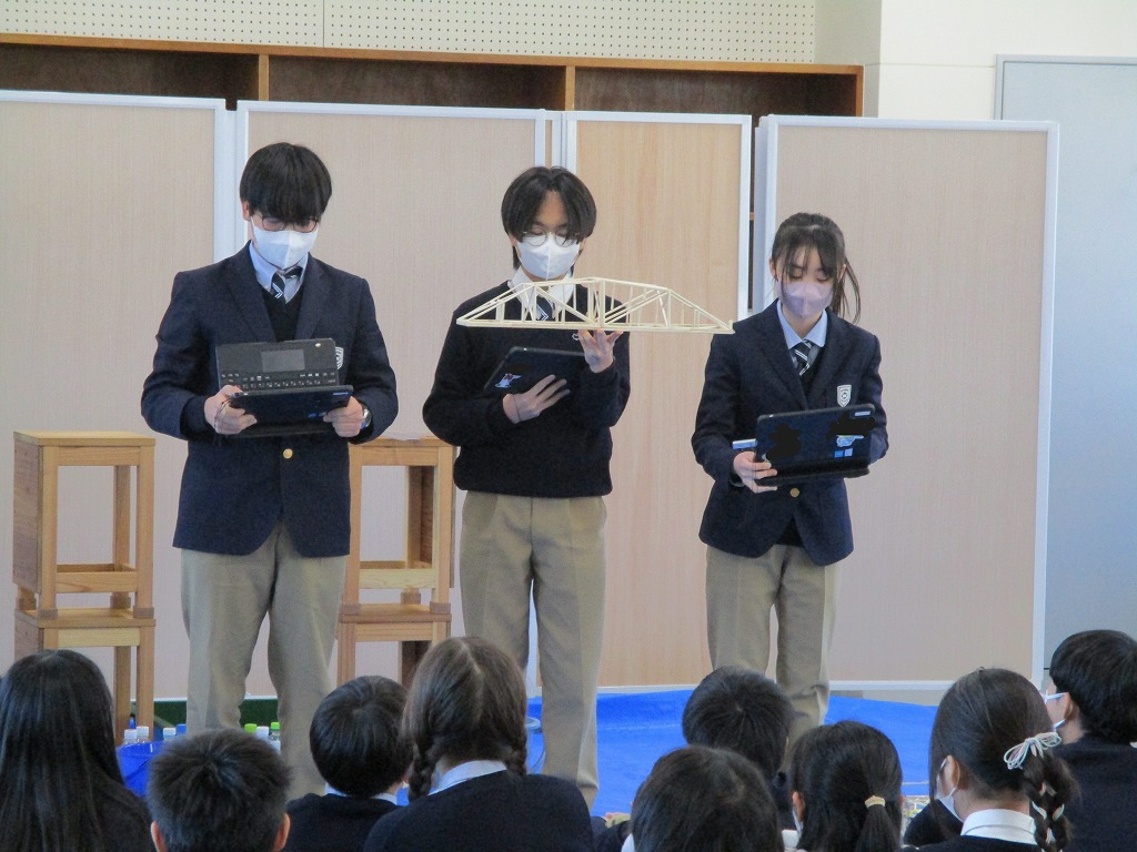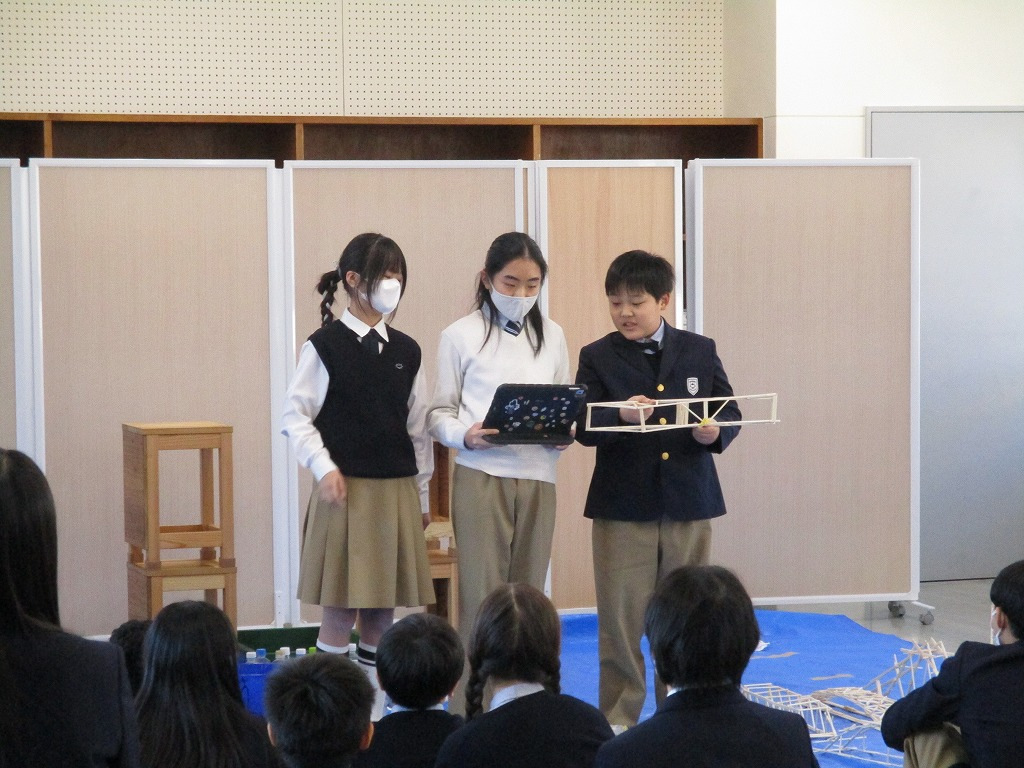 校内の大会に向け、各チーム、橋の構造を計算しながら探究的な学びを進め、本番当日を迎えました。大会では、各チームが制作した橋にバケツをぶら下げ、そのバケツに水を入れていきました。橋が折れないギリギリまでバケツに水を入れ、何キロの水に耐えるのかを競いました。水の量が増えたり、橋がきしむたびに歓声が上がっていました。総合得点では各班のプレゼンテ一ションや橋の美しさの芸術点も含まれました。優勝チームはなんと9㎏120gの重さまで耐えることができました。