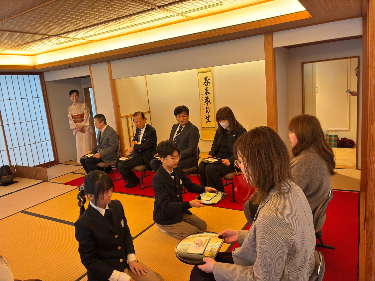 茶会では、子どもたちが心を込めておもてなしをしました。保護者の皆さまには、お茶とお菓子を味わっていただき、会場は和やかであたたかな雰囲気に包まれました。おもてなしの心を大切にする子どもたちの姿から、この6年間の確かな成長を感じるひとときとなりました。