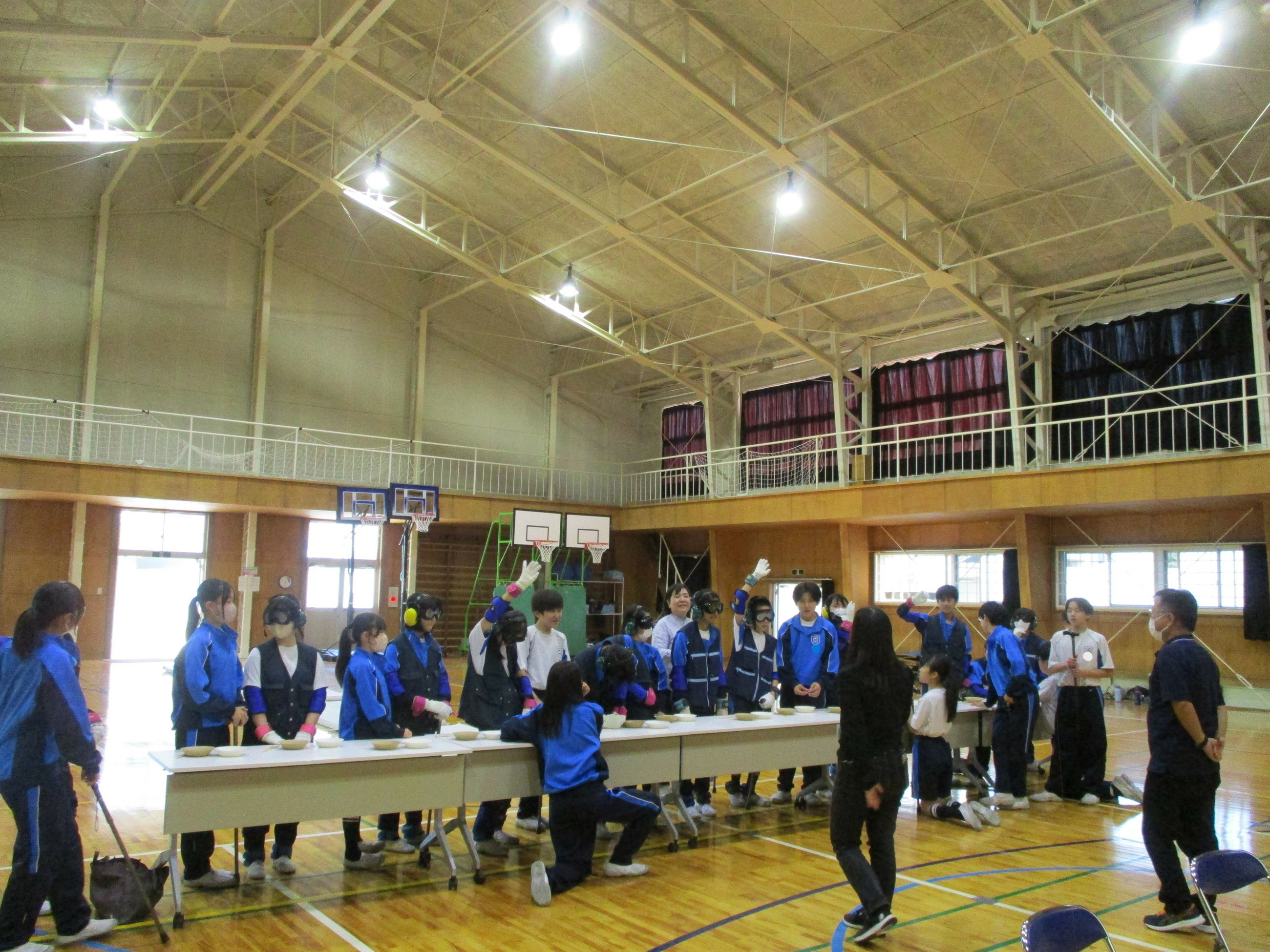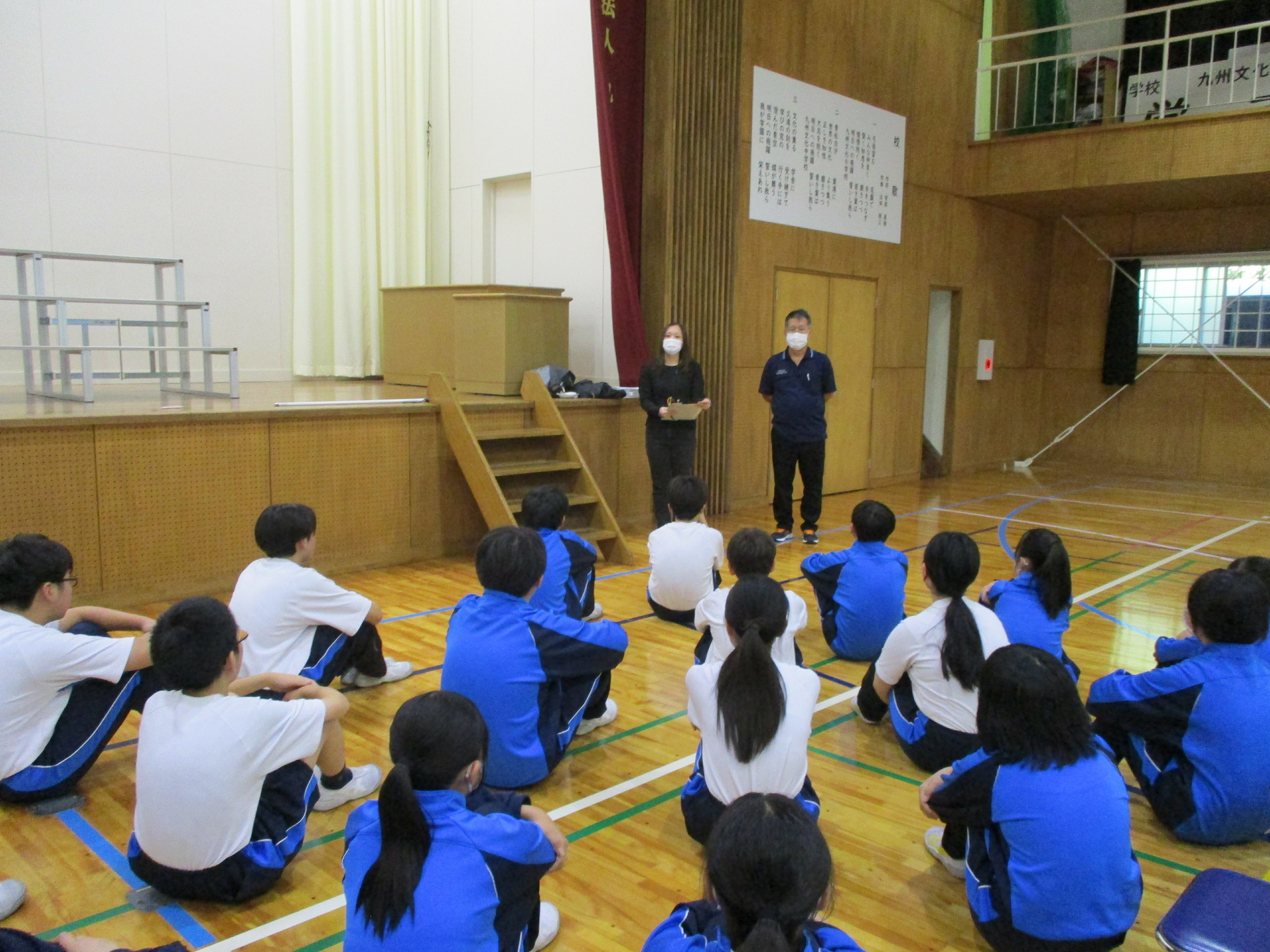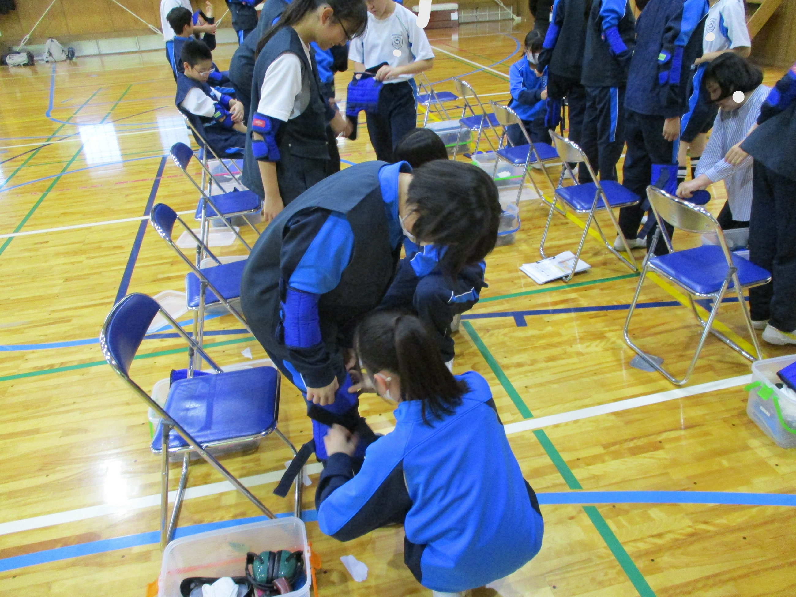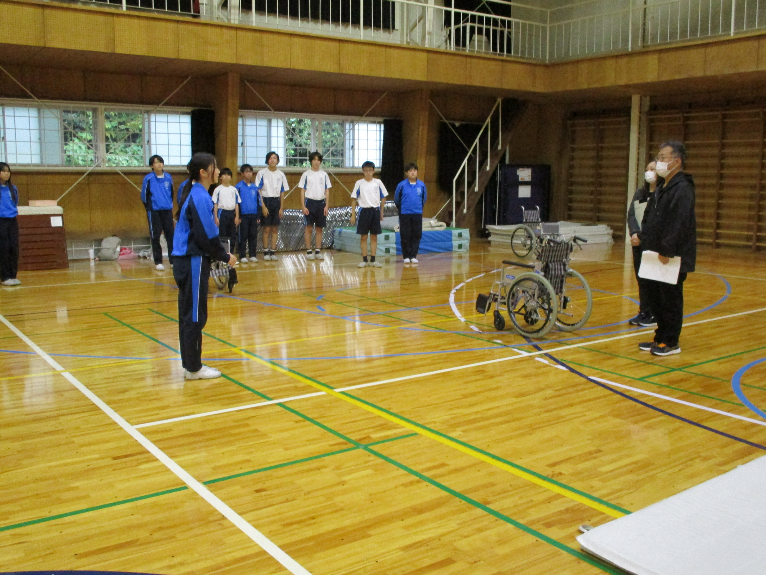 今回、福祉プラザの方にお越しいただき、中学1年生、中学2年生それぞれに、障がい者・高齢者疑似体験教室を行いました。