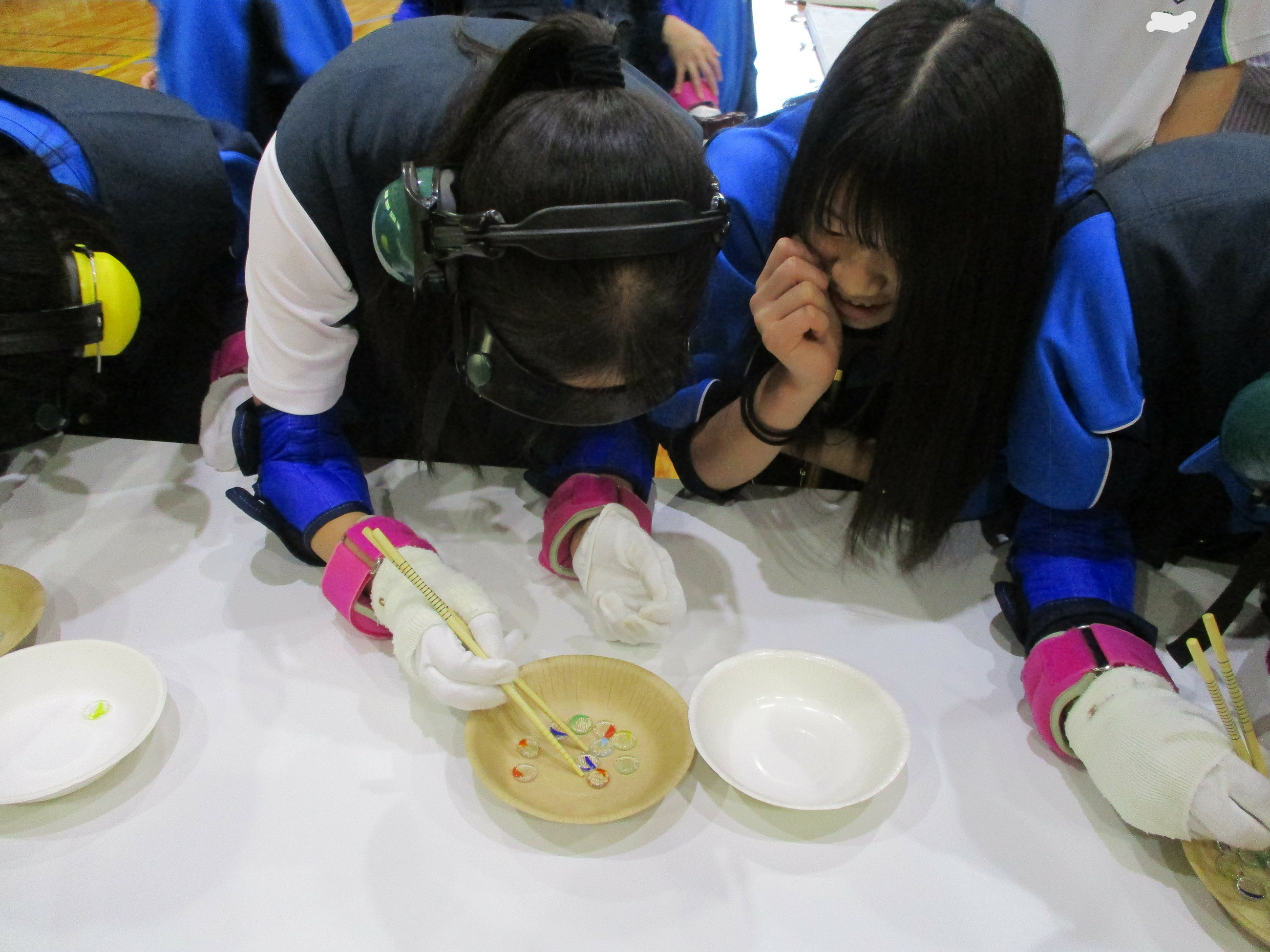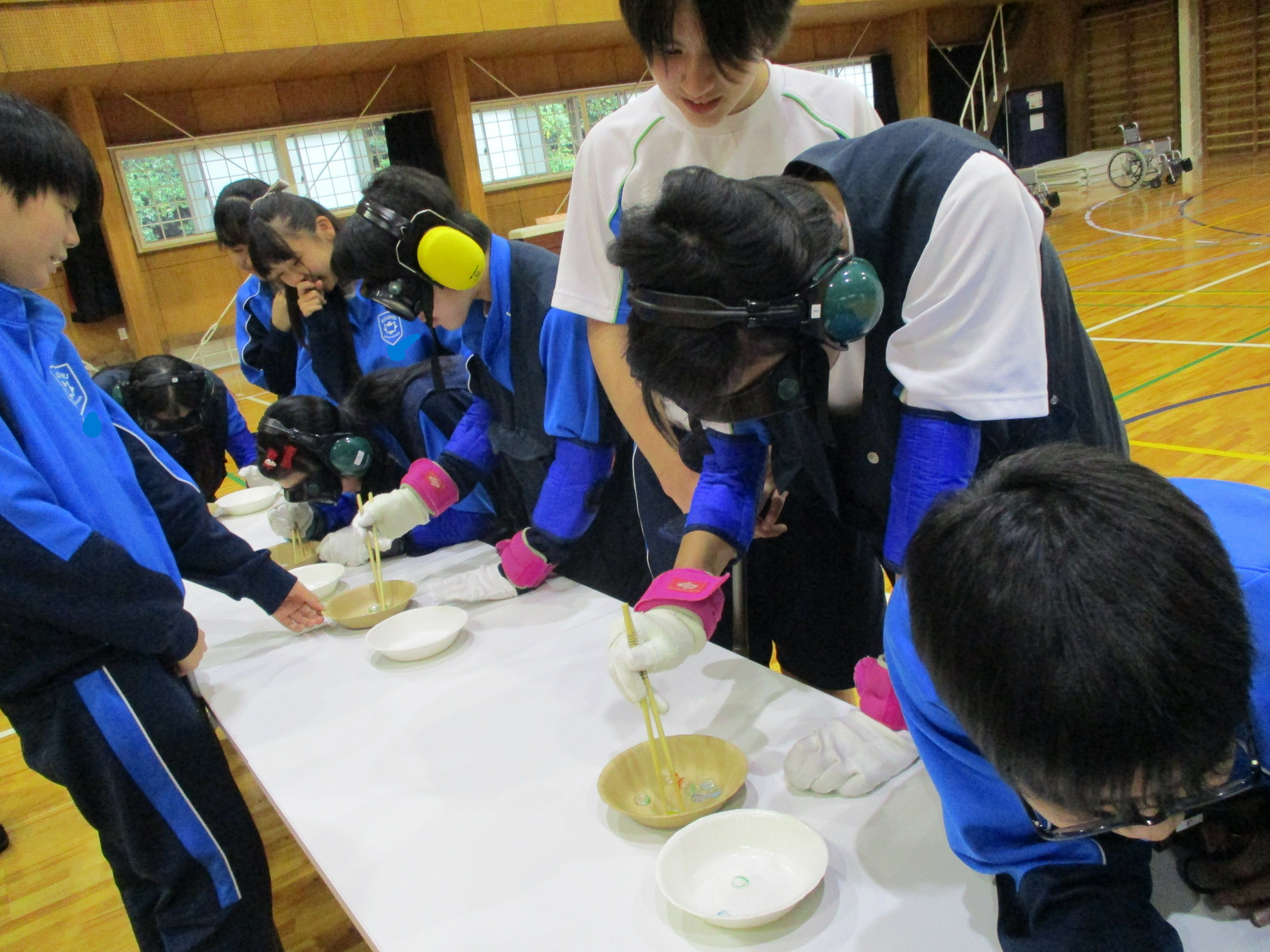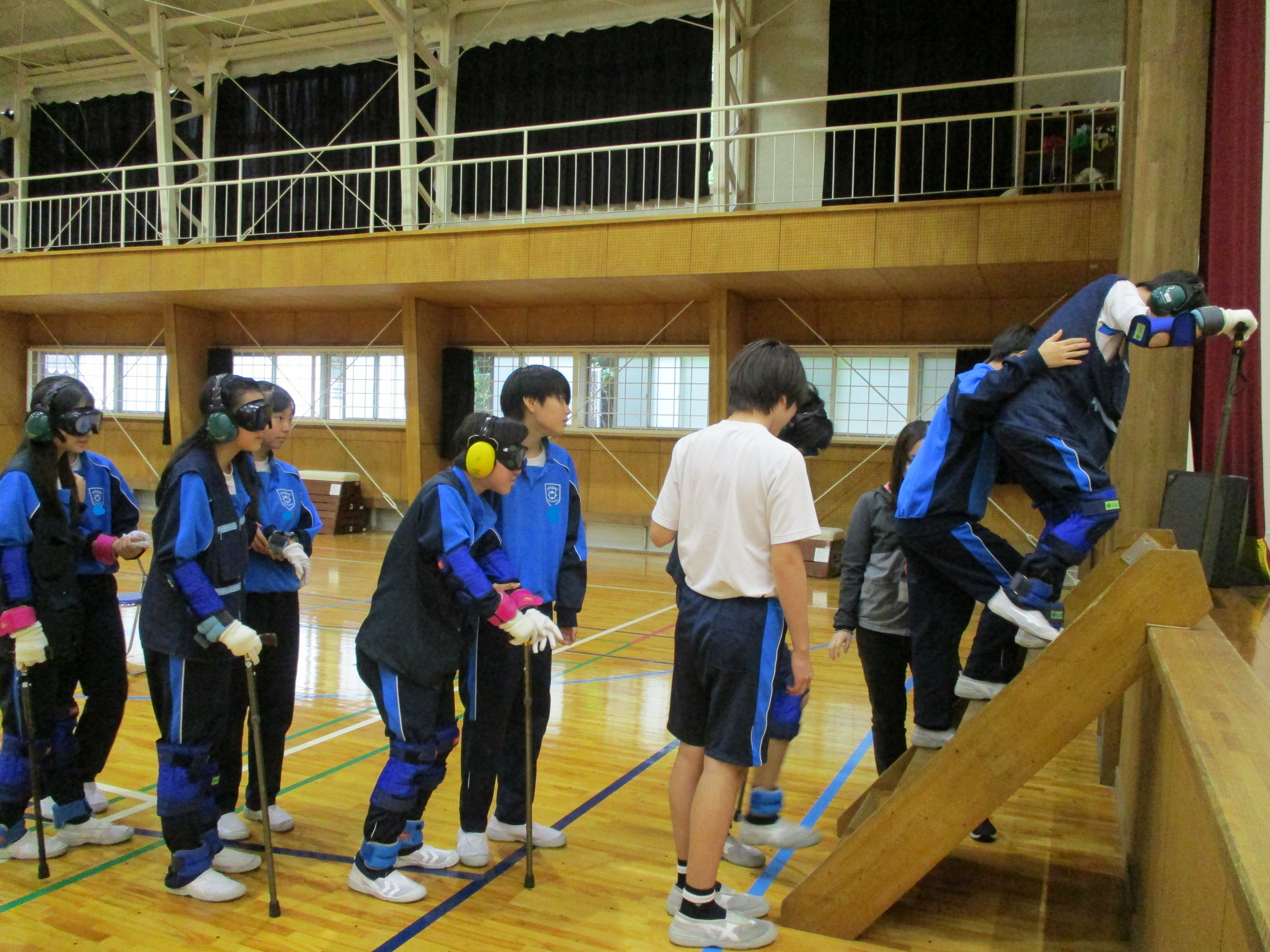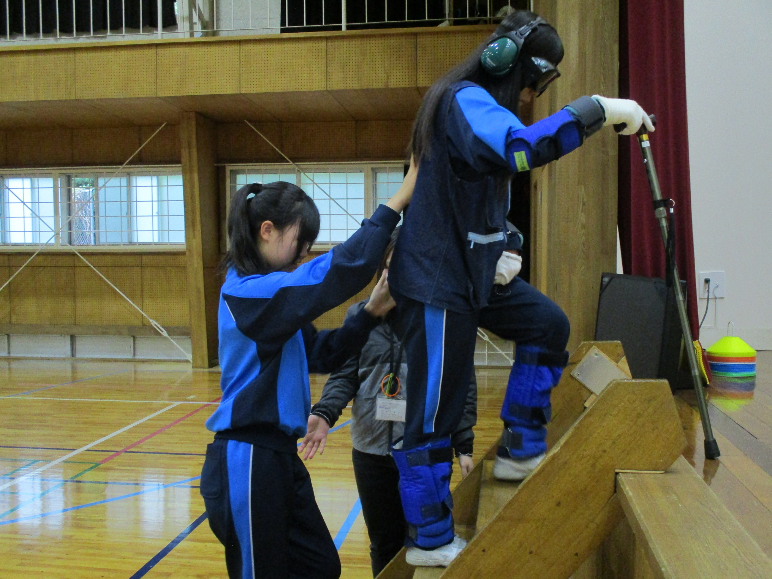 学習の前半は、装具を身に付け、年を重ねるとどのように体が動くか、目の見え方が変わるかなどを体験しました。また、介助の仕方も学びました。視野が狭く良く見えない中で、併せて体も動きにくい状態に、「怖い!」、「よく見えない!」と声をあげる仲間に、的確に指示を出しながら介助している姿が見られました。