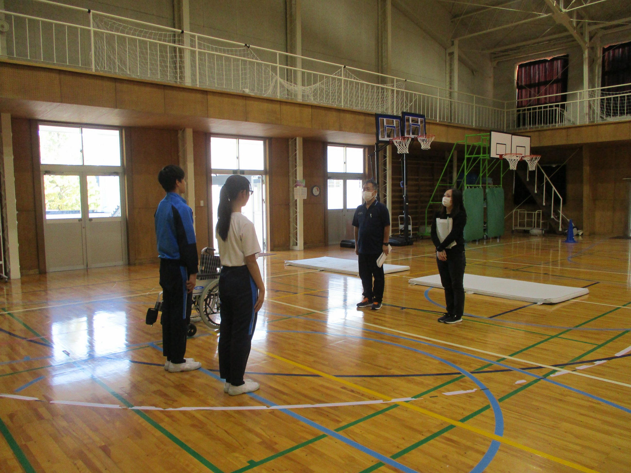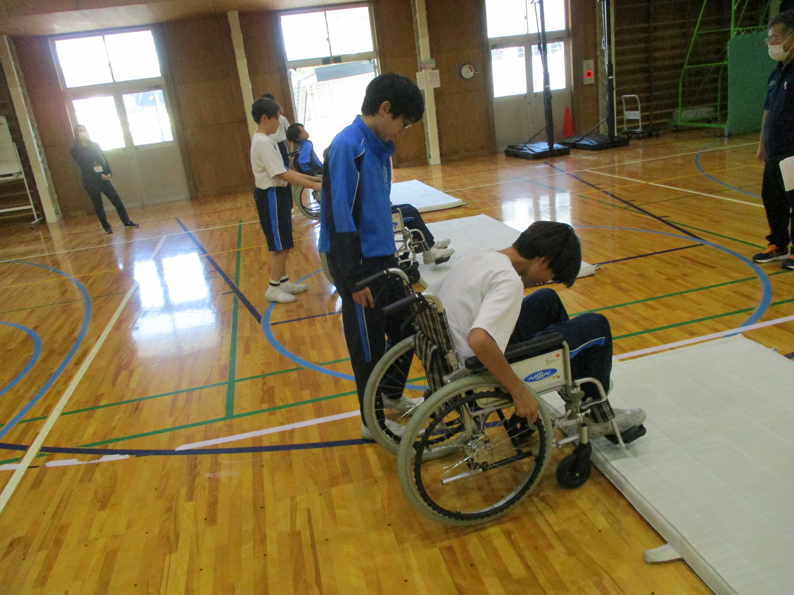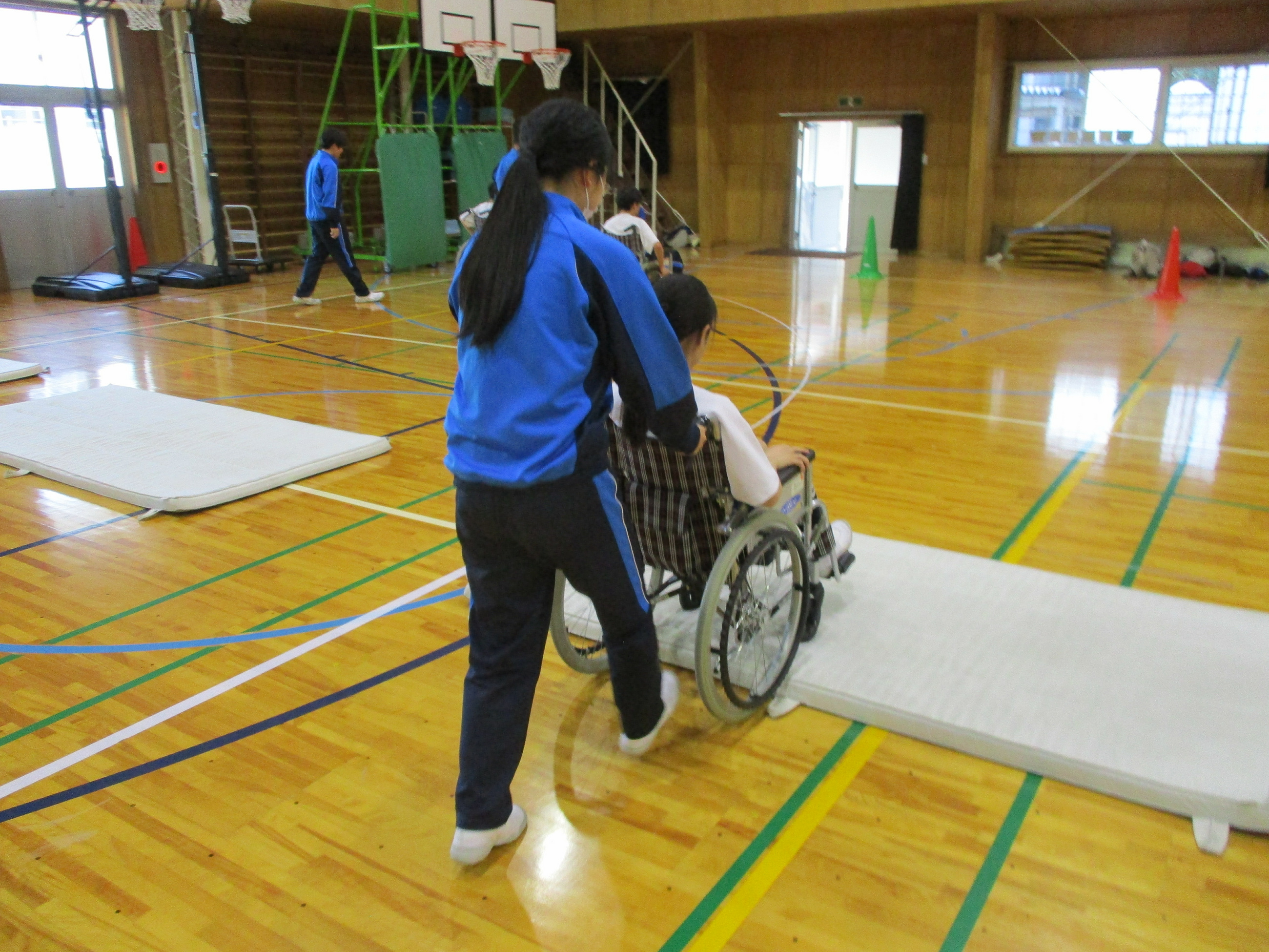 後半は、車いすの使い方、介助の仕方を体験しました。車いすで、マットの段差を乗り越えることに苦戦していましたが、介助する仲間に頼りながら、上手に車いすを使うことができていました。
