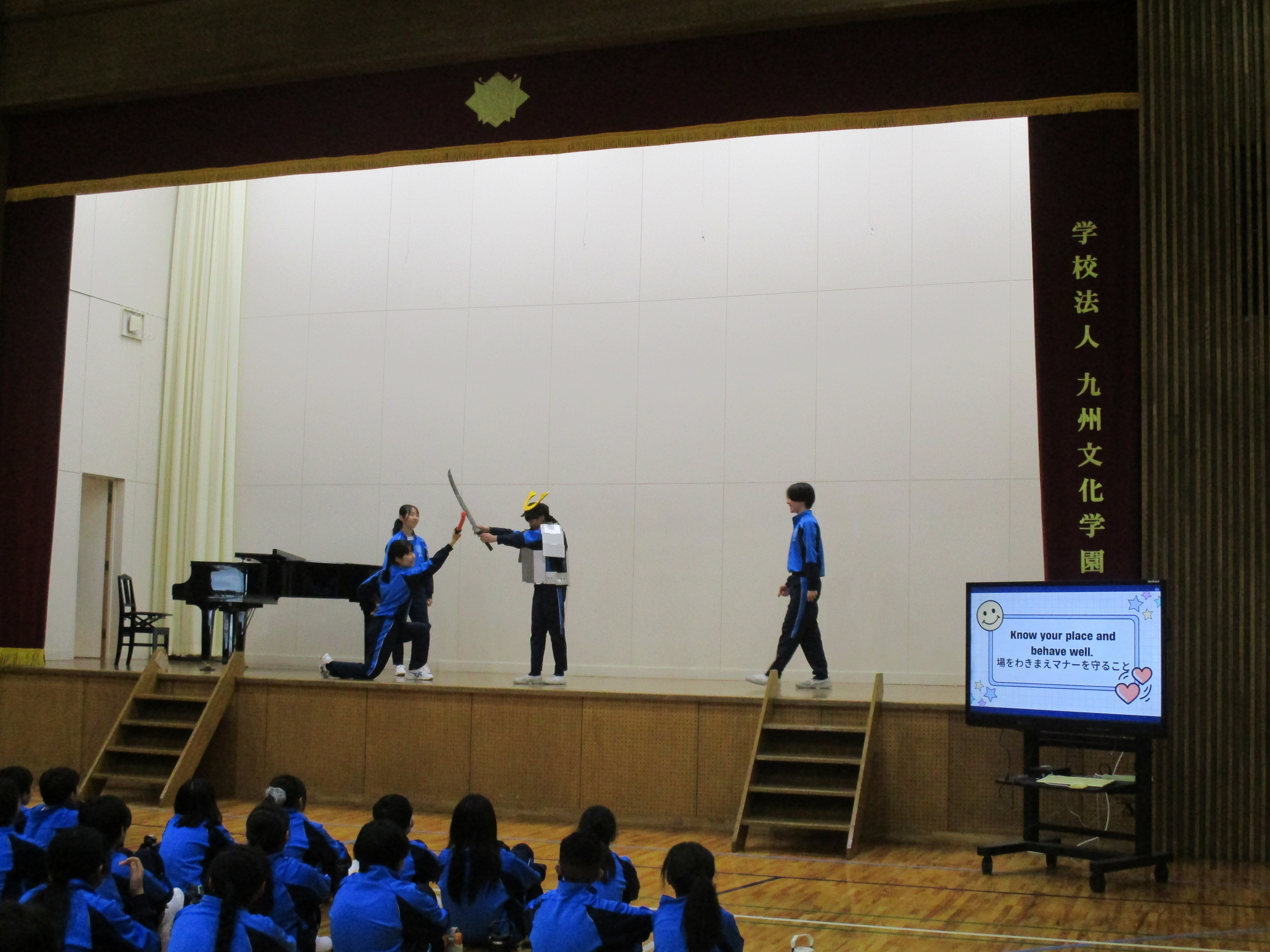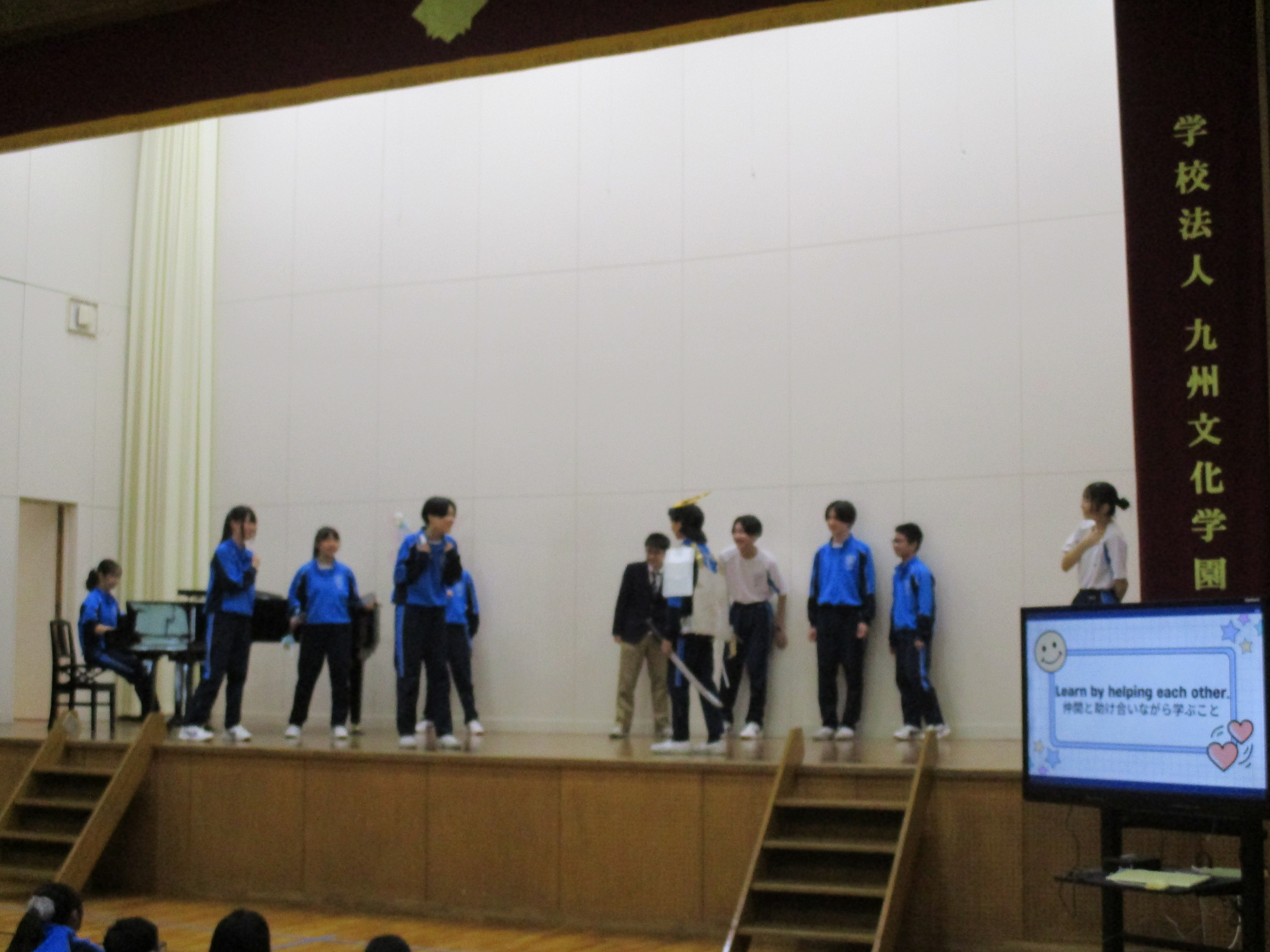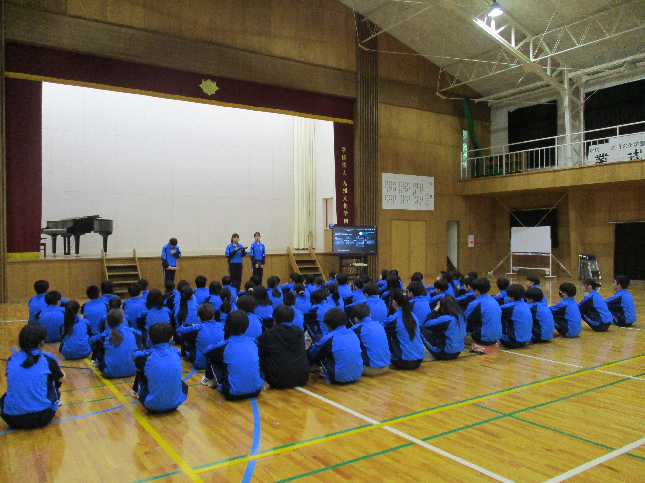 本日、中学校の歓迎行事を行いました。生徒会役員が春休み期間中に準備を進め、本校で学校生活を送る上で大切にしてる生徒心得「KBG’s PRIDE Goal」を分かりやすく伝えるための劇や、歓迎レクリエーションを実施しました。生徒心得の劇では、日常を切り取った中にKBG’s PRIDE Goalを当てはめて生徒会が台本を作成し、練習を重ね、披露しました。歓迎レクリエーションでは、「学校かくれんぼ」、「私は誰でしょう」、「人狼鬼ごっこ」、「ドッヂボール」を行い、それぞれのレクリエーションで上位の生徒には、景品が渡されました。