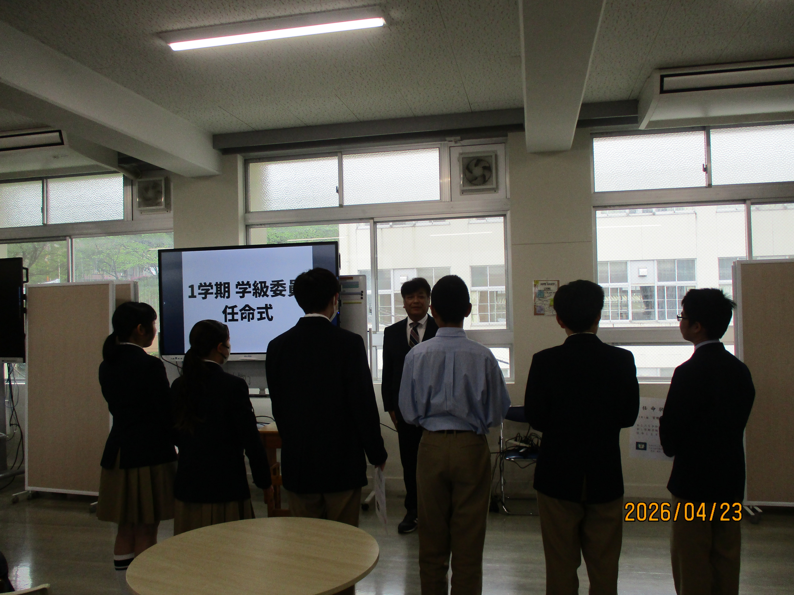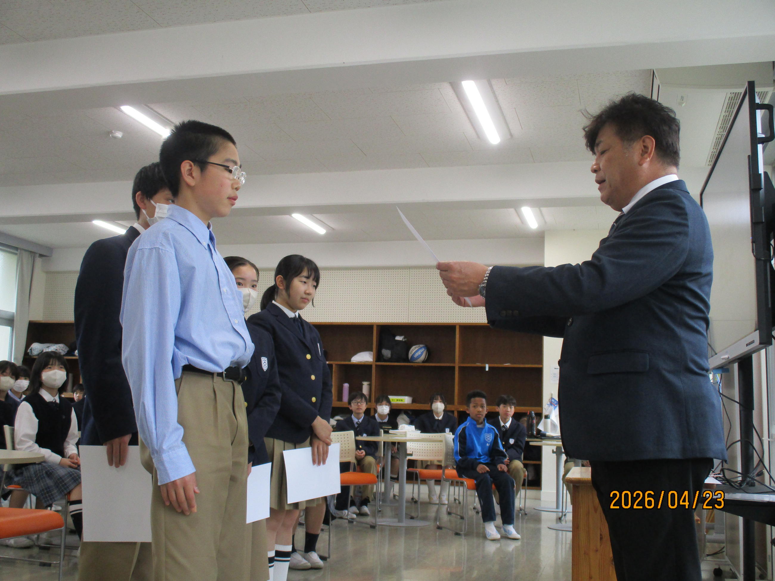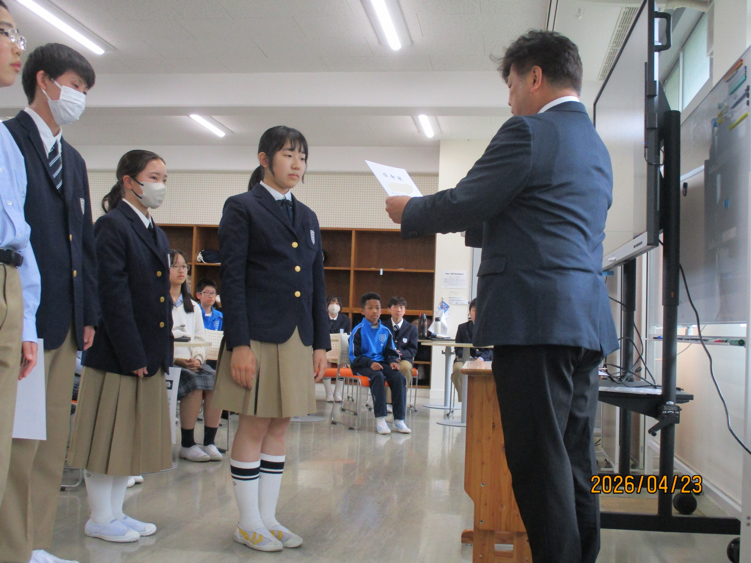 April 23, 2026 4月 学校生活 生徒集会 1学期 学級委員任命式 本日、1学期学級委員の任命式を行いました。 任命式では、校長先生より一人一人に任命状が手渡され、学級の代表としての自覚と責任を新たにする機会となりました。 呼名に応じて前に進み、任命状を受け取る姿からは、これからクラスをまとめていこうとする意欲が感じられました。学級委員は、学級の中心となって仲間と協力しながら、よりよい学級づくりに取り組んでいきます。 フォトギャラリー