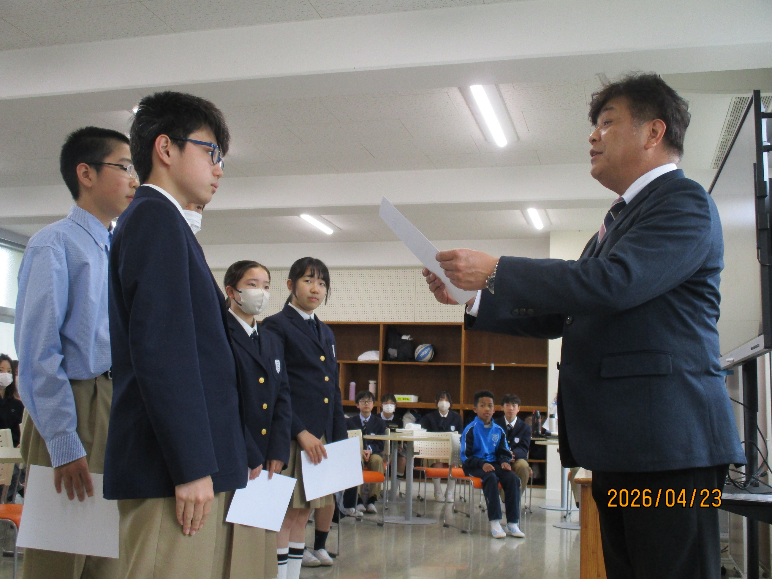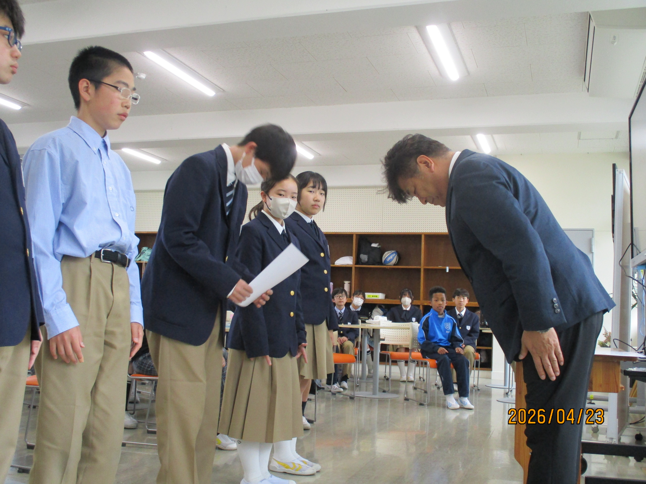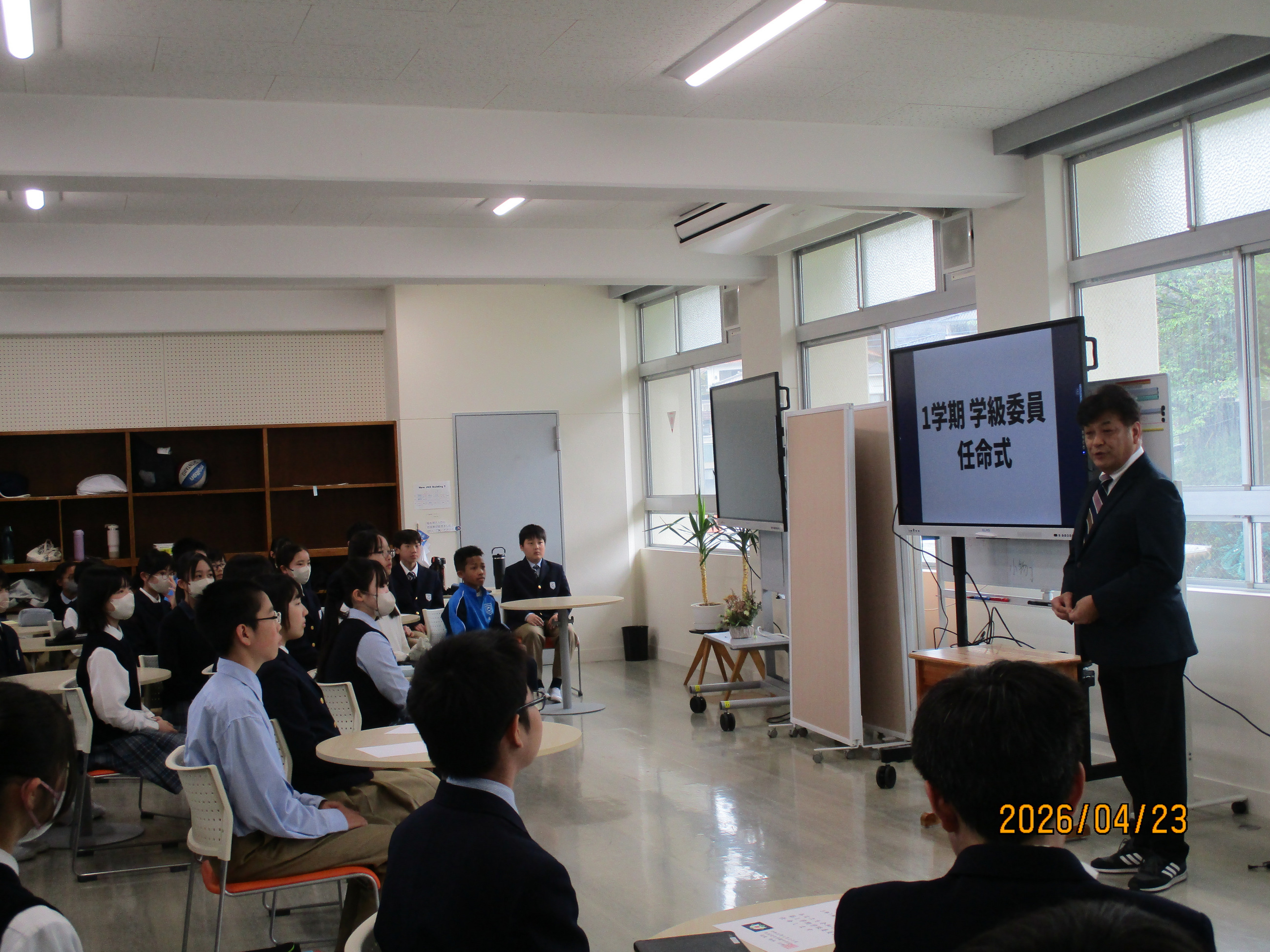 April 23, 2026 4月 学校生活 生徒集会 1学期 学級委員任命式 本日、1学期学級委員の任命式を行いました。 任命式では、校長先生より一人一人に任命状が手渡され、学級の代表としての自覚と責任を新たにする機会となりました。 呼名に応じて前に進み、任命状を受け取る姿からは、これからクラスをまとめていこうとする意欲が感じられました。学級委員は、学級の中心となって仲間と協力しながら、よりよい学級づくりに取り組んでいきます。 フォトギャラリー